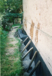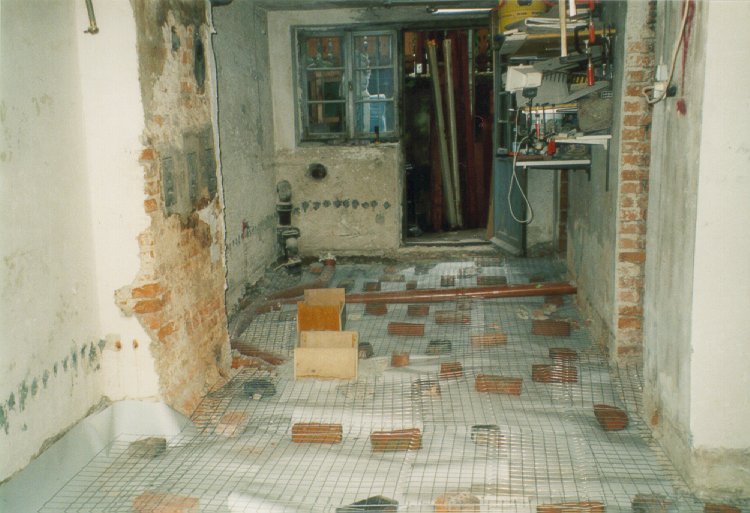 Problem: Feuchtigkeit in Kellerwand Die Außenwände des Kellerraums aus ca. 45 cm Beton liegen zu 75% der Höhe im Erdreich und waren weder innen noch außen isoliert. Ein Fundament ist nicht vorhanden. Der Fußboden bestand seit über 70 Jahren aus Holzdielen, welche direkt auf dem Kiesuntergrund aufgelegen waren, und die Querbalken haben zu ca. 20 cm in der Betonwand gesteckt. Die Querbalken waren im nahen Bereich der Wände so gut wie nicht mehr vorhanden, und besonders in den Ecken waren die Bodenbretter völlig morsch. Die Wände selbst waren von Fechtigkeit durchzogen, was sich durch Flecken und Schwitzwasser deutlich bemerkbar gemacht hat. Die Ursachen lagen also zusammengefaßt in der fehlenden Außenisolierung der Wände und in der aufsteigenden Feuchtigkeit von unten.